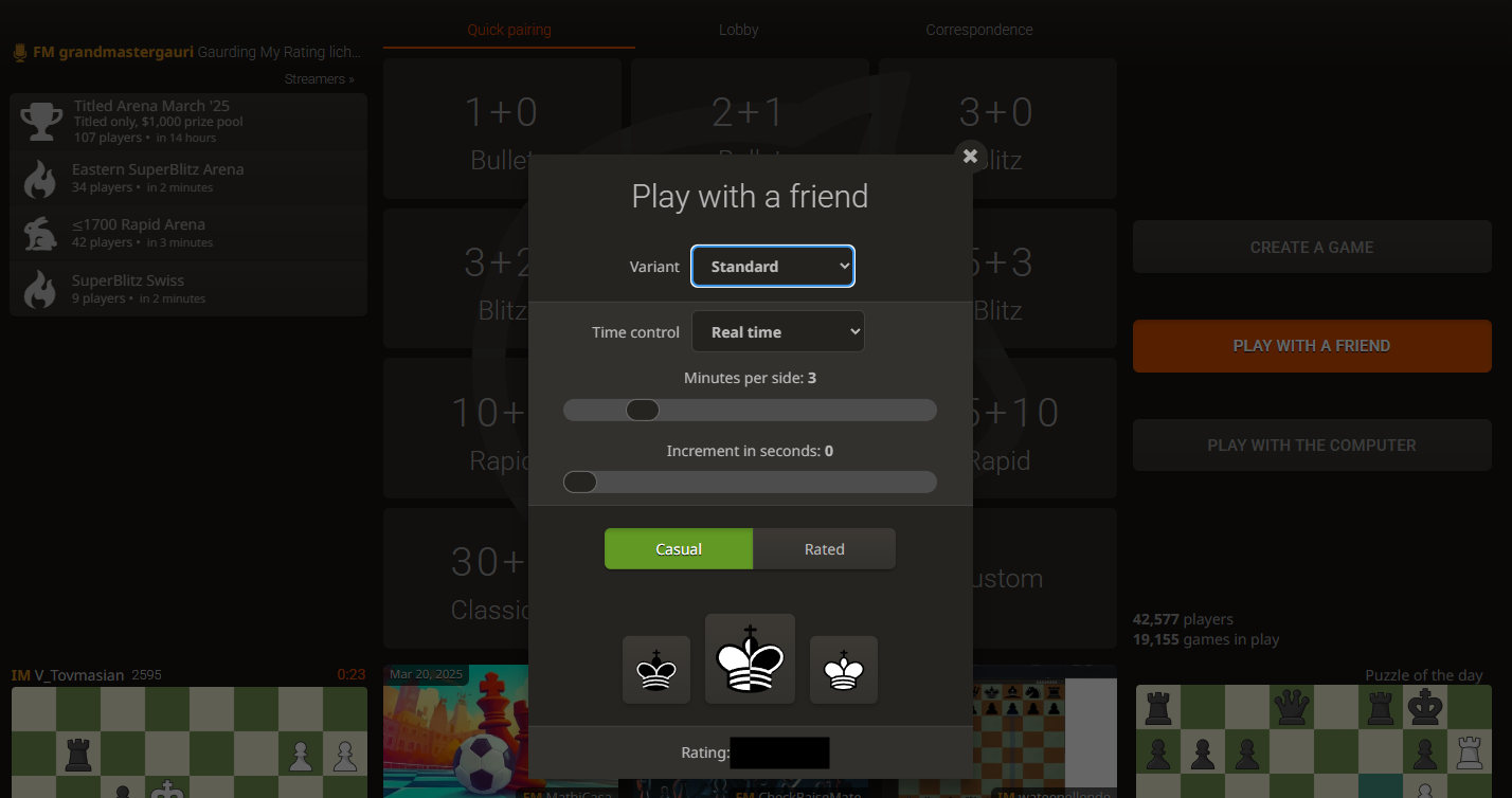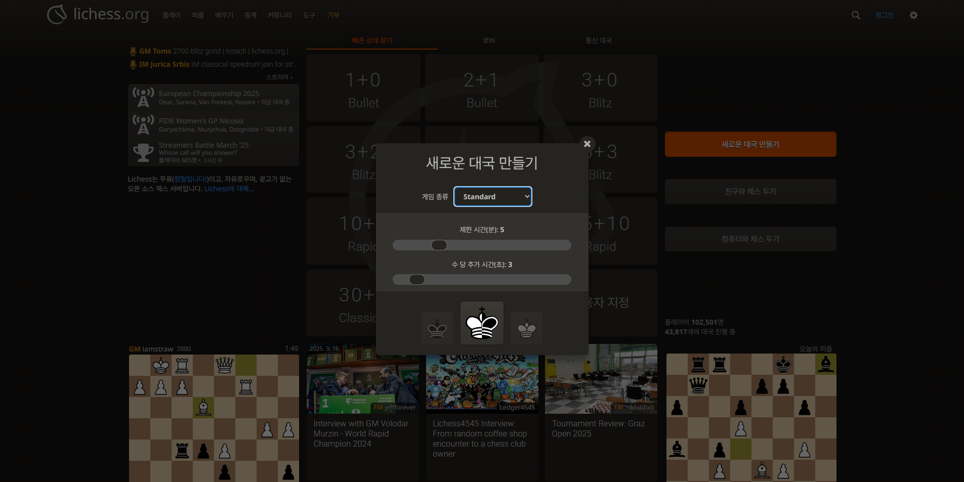 Lichess.org에서는 이런 설정을 먼저 하고 나서, 자신이 흑과 백 중 무엇을 할지 고르면