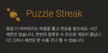 퍼즐 스트릭은 연속 정답 도전 모드입니다. 점점 난이도가 높아지는 퍼즐을 맞히며 연속 기록을 세우는 방식인데, 한 문제라도 틀리면 스트릭이 끊기기 때문에 집중력과 정확도를 동시에 요구합니다.