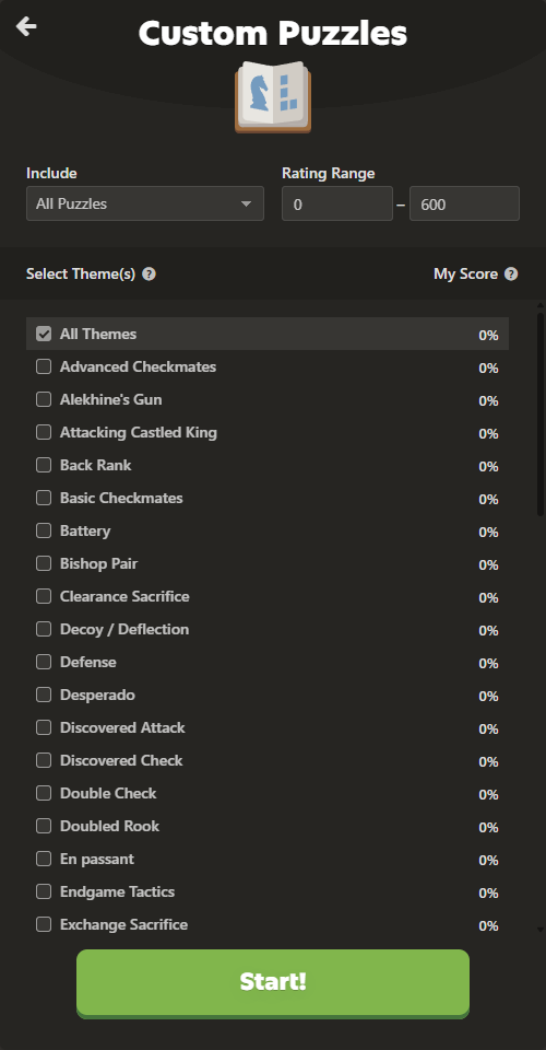 사용자는 원하는 전술 테마를 고르고, 퍼즐의 난이도도 레이팅 범위를 설정해서 세밀하게 조정할 수 있습니다. 다만 퍼즐 레이팅이 항상 신뢰할 수 있을 정도로 정확하진 않다는 점은 참고하시는 게 좋습니다.
