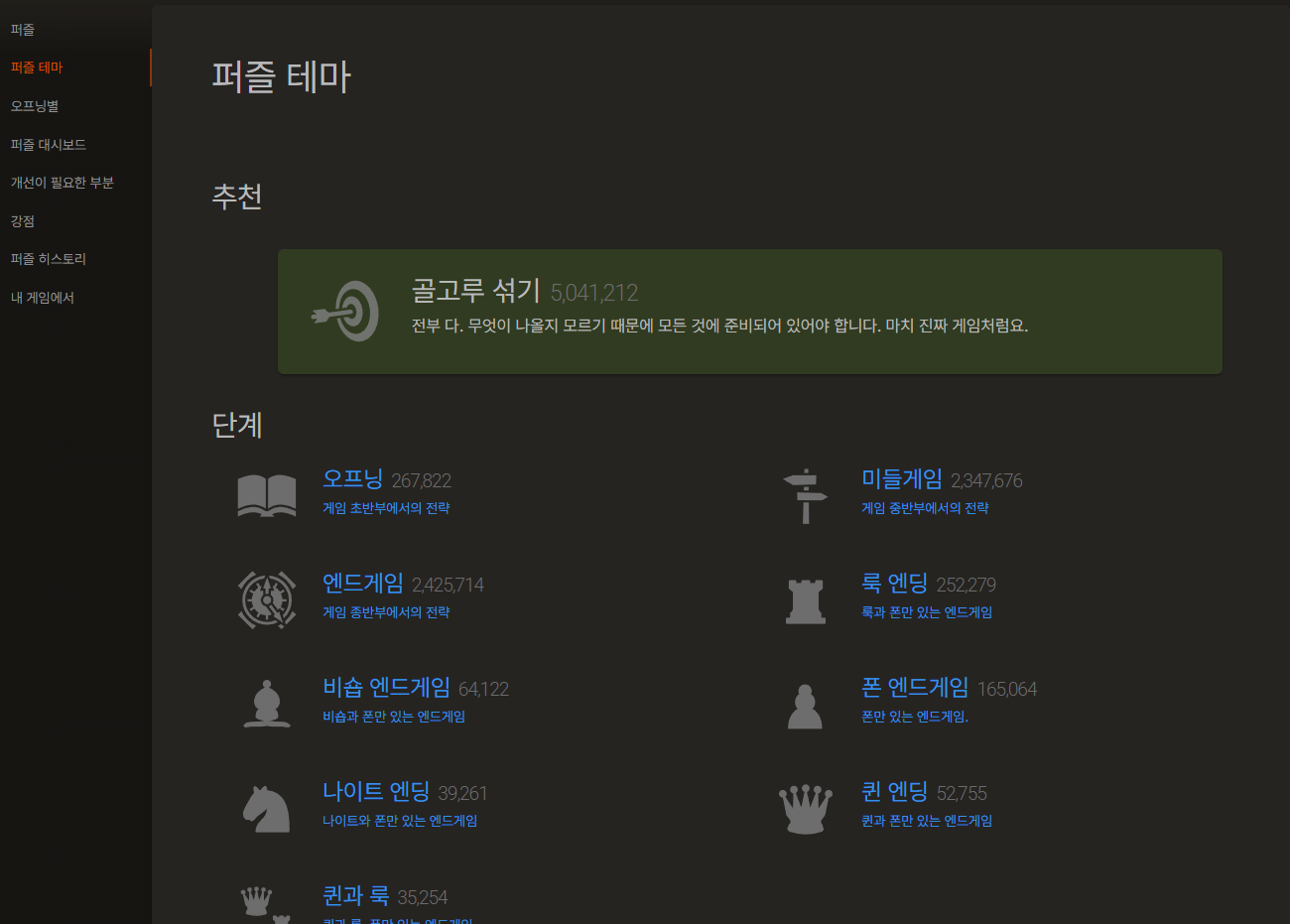 그다음으로 제일 많이 이용할 기능은 아무래도 퍼즐이겠습니다. 체스를 잘하는 방법을 찾아보면 대부분 '전술을 연습하라'고 하고, 전술을 연습하는 가장 좋은 방법은 퍼즐을 푸는 것이기 때문이죠.