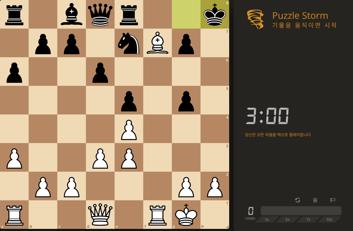 퍼즐 스톰은 제한된 시간 안에 최대한 많은 퍼즐을 푸는 모드입니다. 퍼즐 하나를 맞힐 때마다 1점을 얻고, 시간이 다 떨어지기 전까지 계속 도전할 수 있습니다. 하지만 실수하면 콤보 바가 초기화되고, 벌점으로 10초가 차감됩니다. 그래서 퍼즐 스톰은 무작정 빠르게만 풀기보다는, 정확도를 유지하면서 속도도 챙겨야 하는 밸런스 게임처럼 느껴집니다. 또한 한 번의 플레이에서는 항상 같은 색(흑 또는 백)으로만 풀게 되어 있어, 흐름을 끊지 않고 집중해서 몰입할 수 있다는 점도 장점입니다.