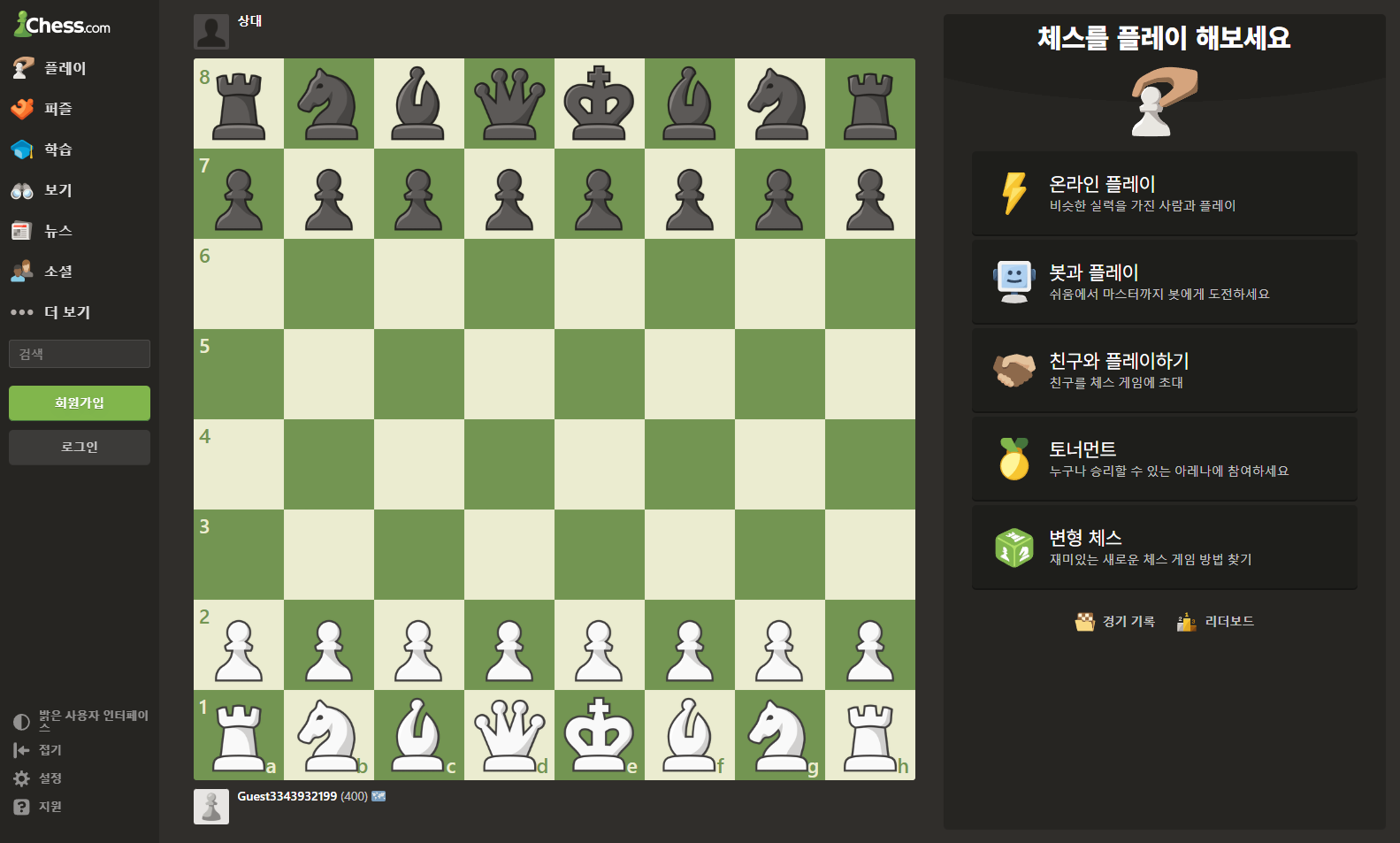 회원 가입, 광고, 플러그인 없이 즐길 수 있는 깔끔한 구성의 무료 온라인 체스 게임입니다. 컴퓨터, 친구 또는 무작위로 고른 상대와 함께 체스를 즐겨보세요.