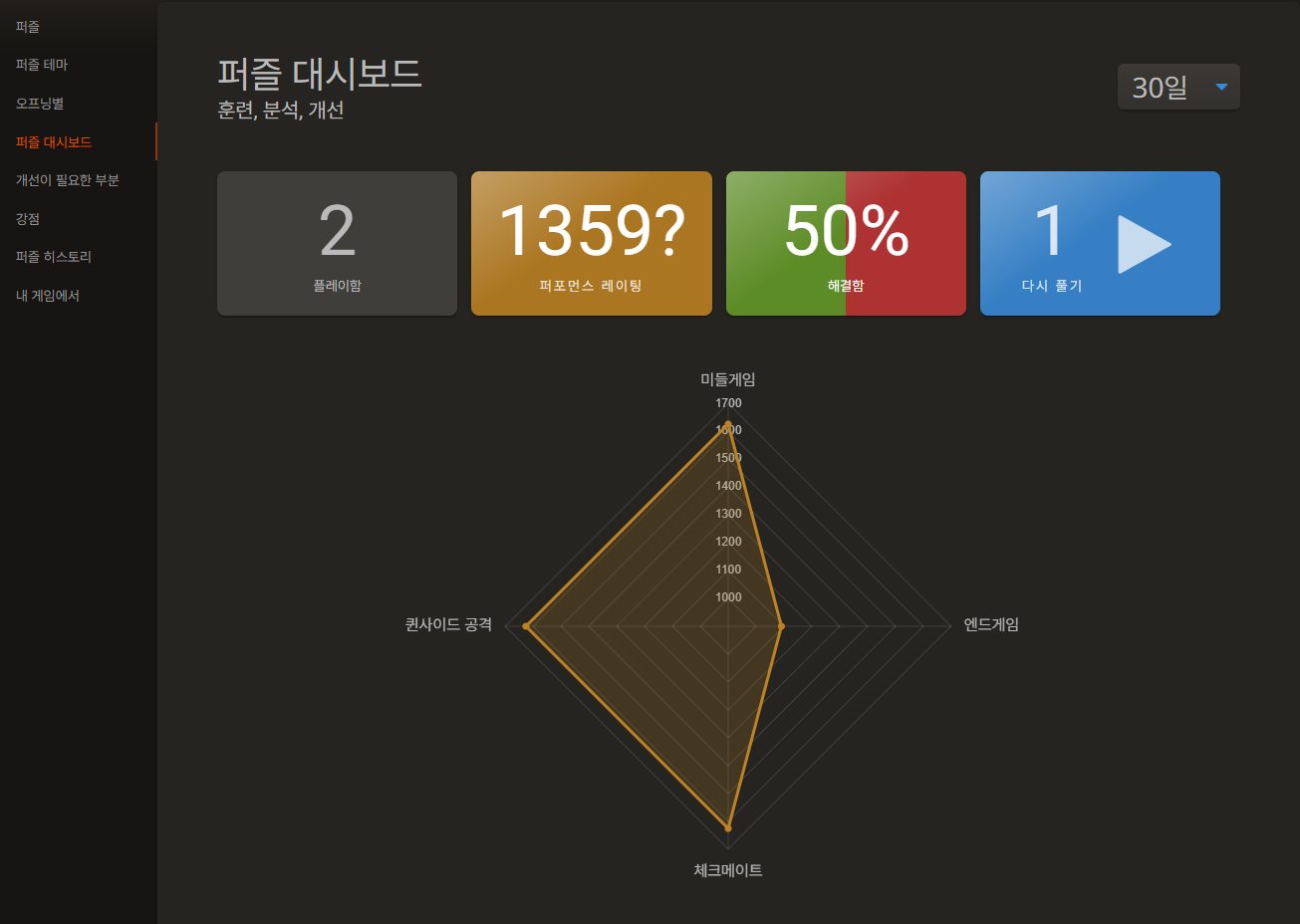 퍼즐 대시보드는 본인의 퍼즐 수행 결과를 시각적으로 정리해 보여주는 통계 페이지입니다. 어떤 테마에 강한지, 어느 유형에서 자주 틀리는지 등을 한눈에 파악할 수 있어, 자기 진단과 훈련 방향 설정에 큰 도움이 됩니다.